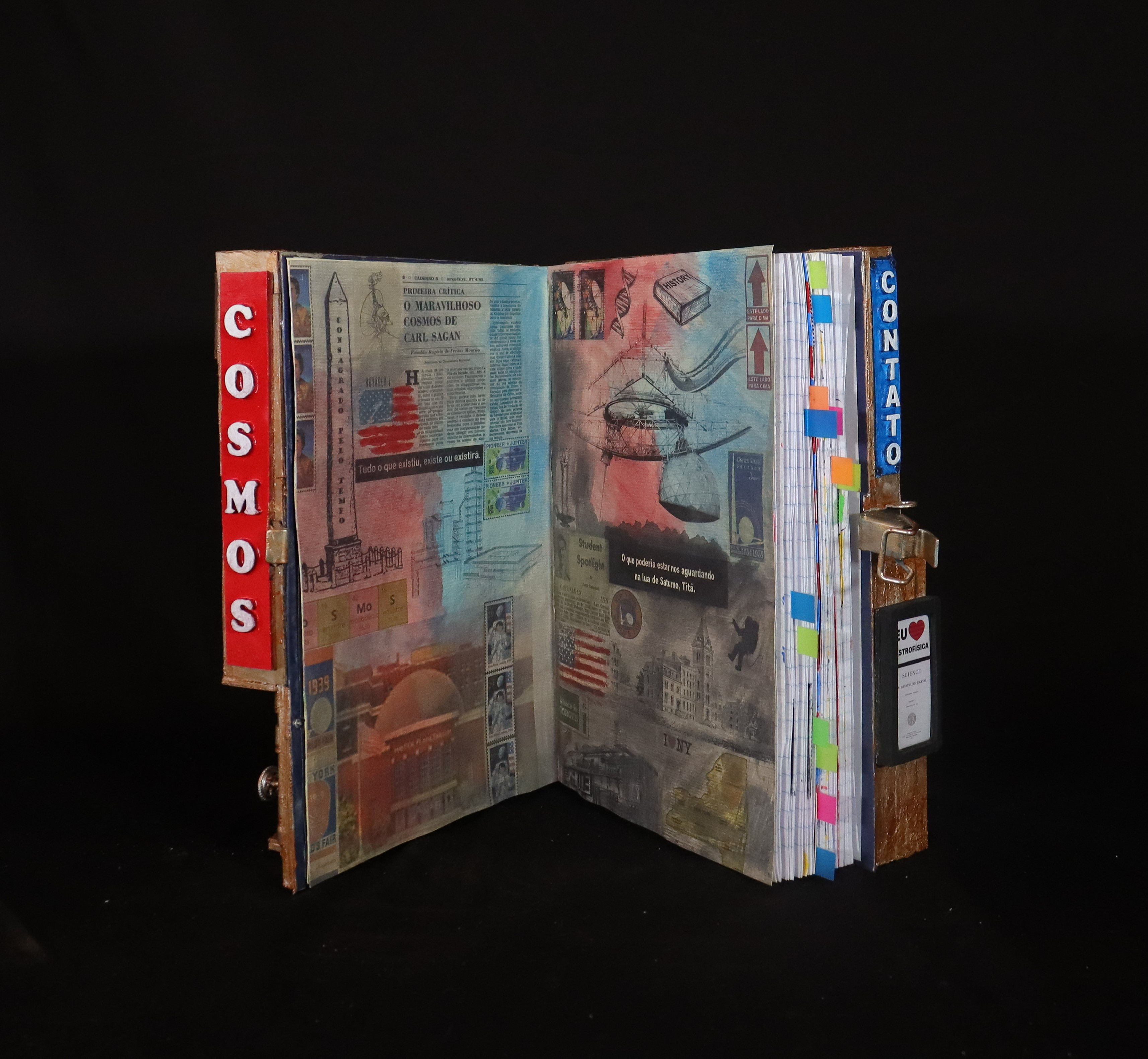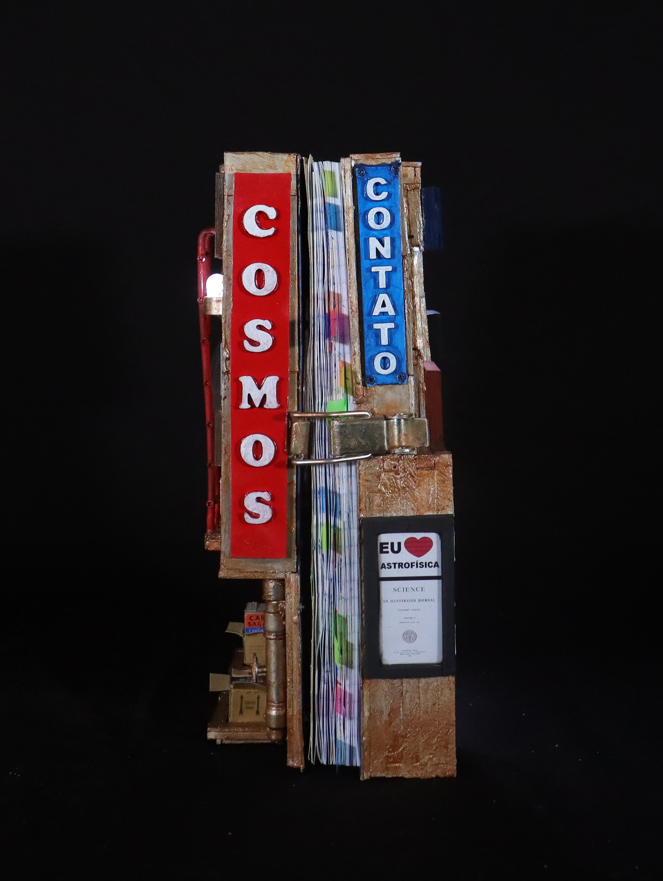 Mesmo num universo tomado pela matéria escura da ignorância, deve haver uma chama de arte capaz de brilhar com a luz do conhecimento. Eis o tema de O Mundo Iluminado pelos Astrônomos – A Ciência Vista como um Livro Aceso na Escuridão, uma proposta de obra criada como livro de artista, em formato e tamanho de caderno, com uma capa muito especial, cujo cenário construído arquitetonicamente com palavras expõe mais uma vez minha marca registrada, a de um artesão que não se cansa de inventar novas formas de construir o que dizer. É neste diário de criação que se descobre todos os textos, desenhos, pinturas e colagens que serviram de base para as pesquisas e estudos que tive de fazer no processo de produção de minhas construções arquiliterárias da série Cosmos. Produzido de forma artesanal, por meio de uma estética steampunk, toda a sua estrutura tridimensional faz lembrar um objeto antigo e raro, uma espécie de relíquia reencontrada em algum lugar perdido na Terra, concebida como preciosidade nessa mistura de livro de artista e escultura em mídia mista. Como eu mesmo costumo dizer em meus depoimentos pessoais, se cada leitura traz consigo uma obra diferente, cada livro requer a construção de um novo trabalho.