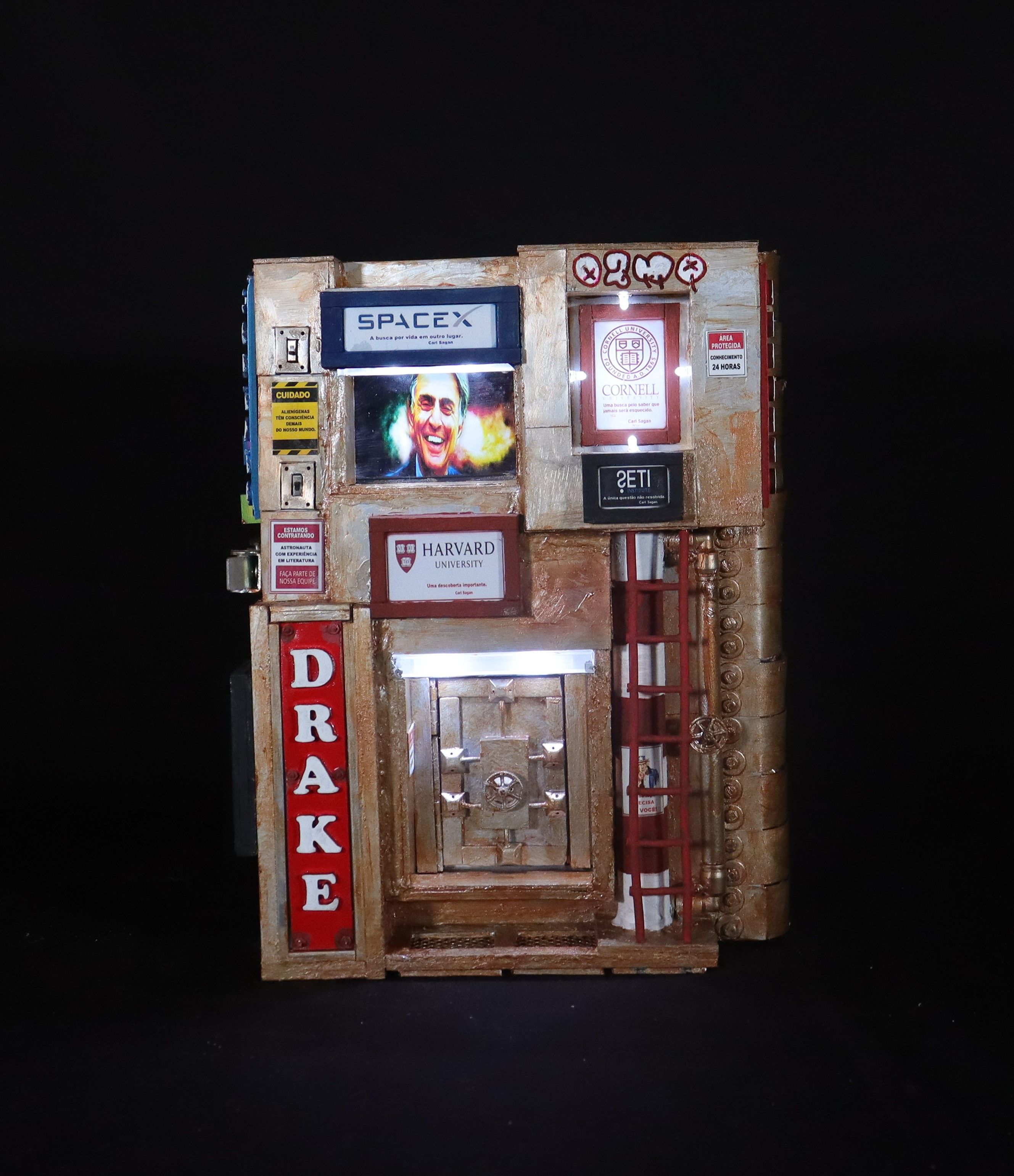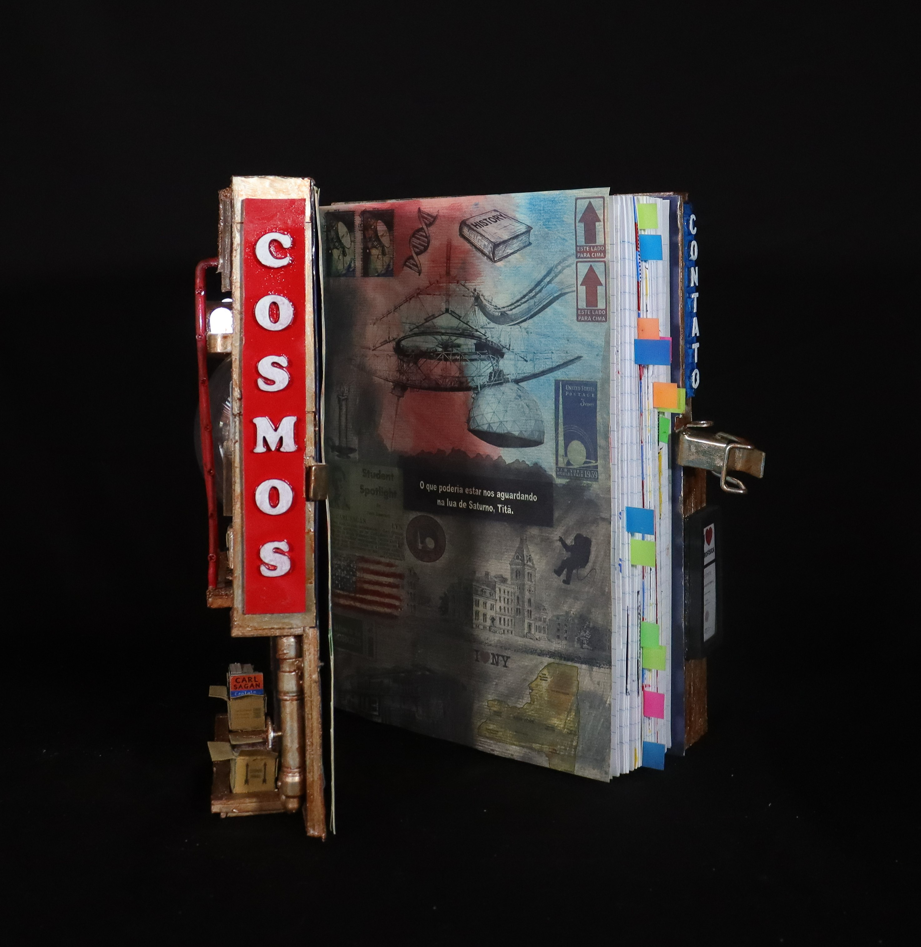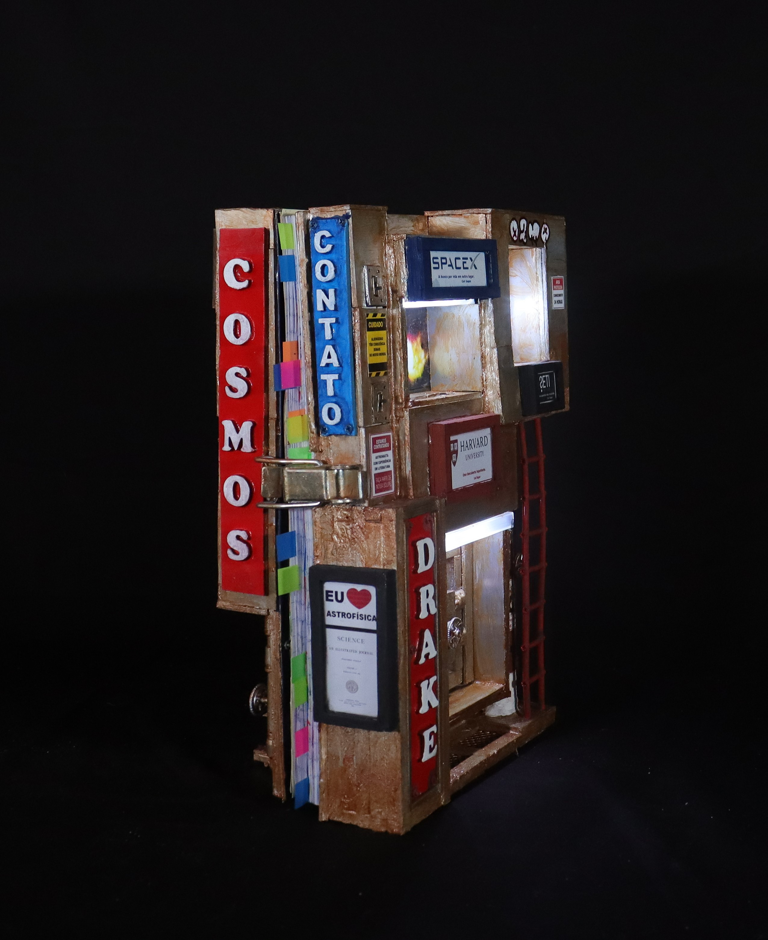 Livro de Artista | Construção Arquiliterária em andamento | Título: O Mundo Iluminado pelos Astrônomos – A Ciência Vista Como Um Livro Aceso na Escuridão | Dimensões: 29x22x13cm | Técnica: Assemblage | Tipo: Escultura em Mídia Mista | Ano: 2022 (2025 – Sendo Revisto e Ampliado)