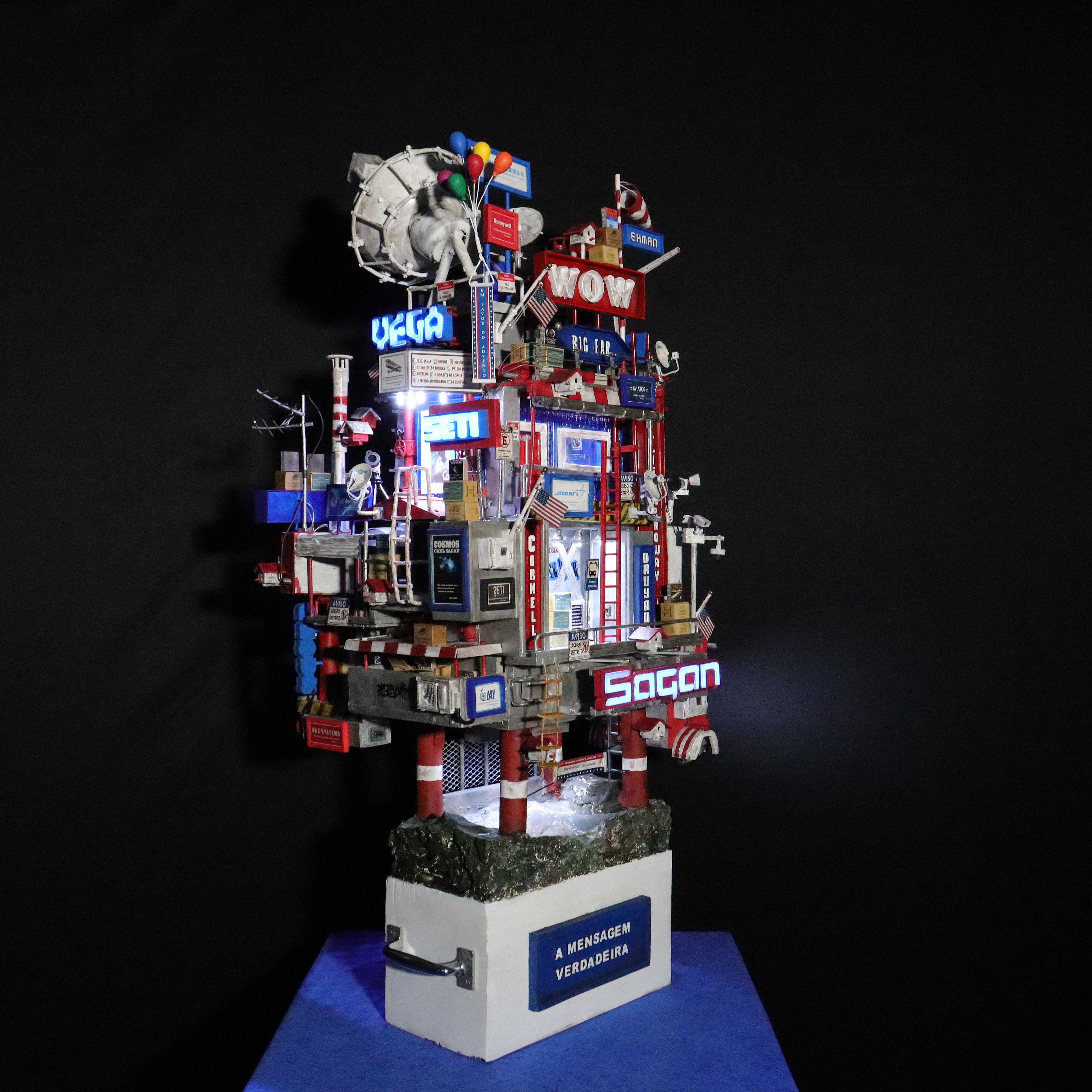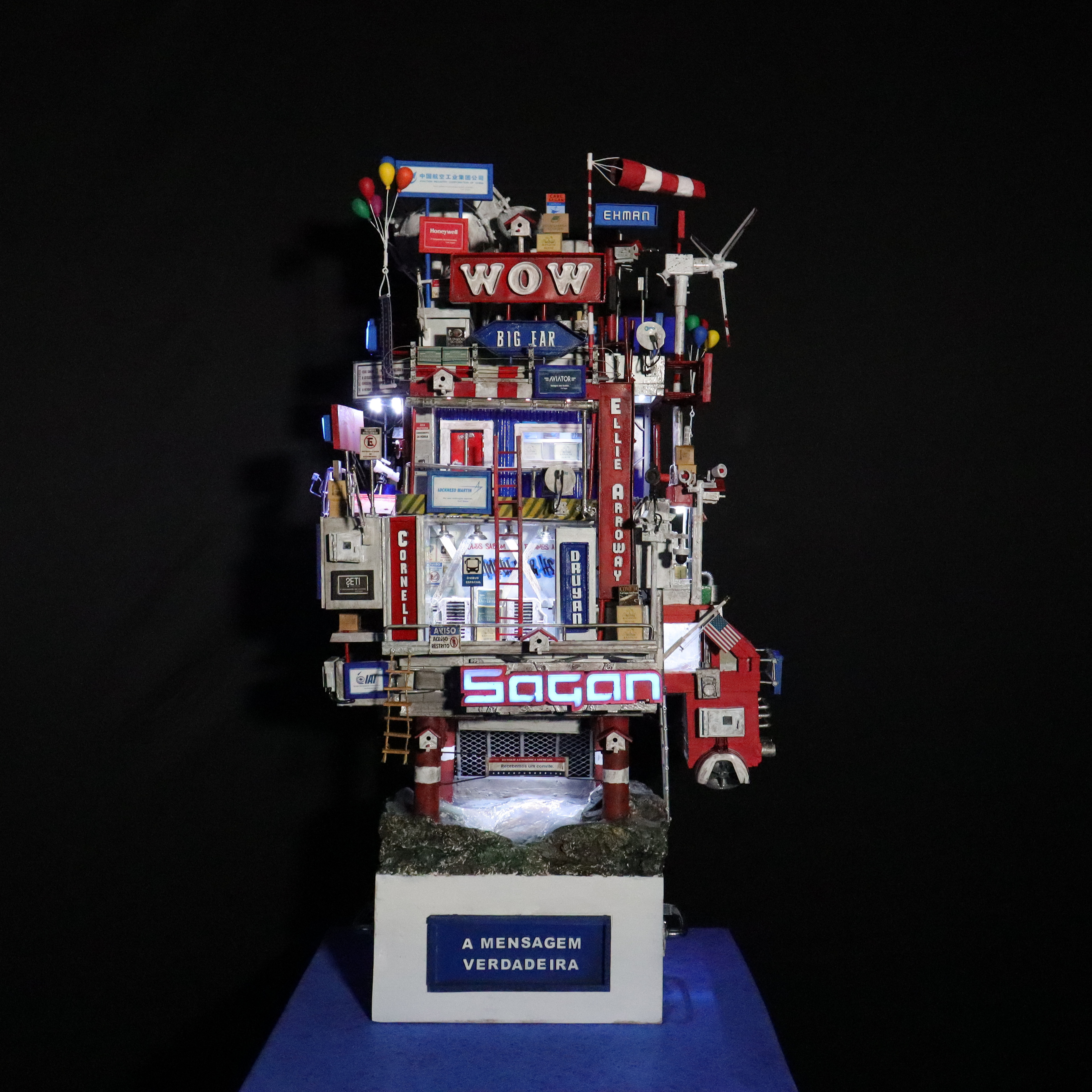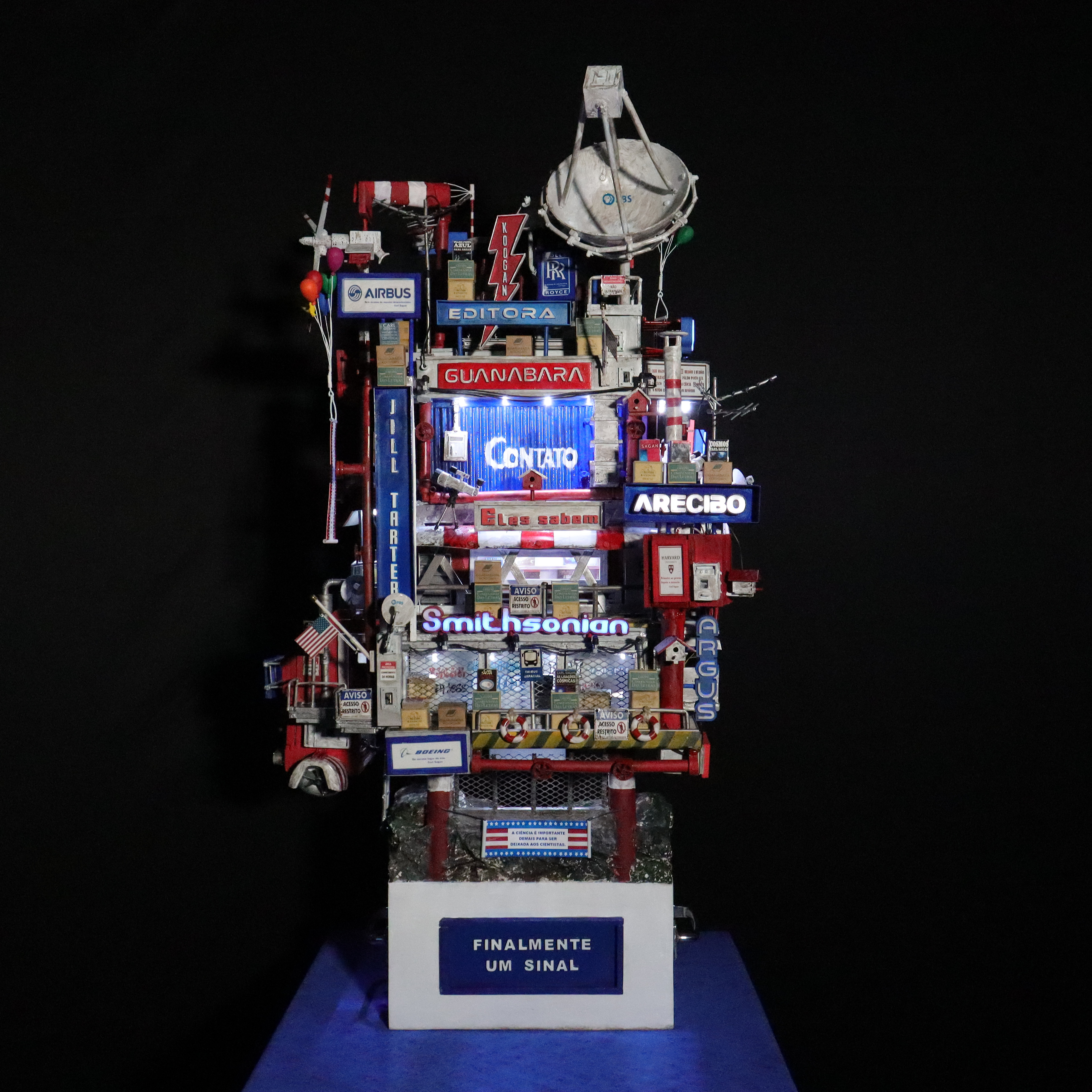 Quando a humanidade estiver pronta e for inteligente o suficiente para entender aquilo que captou como último contato, finalmente um sinal acontecerá e a mensagem verdadeira lembrará ao mundo sobre Carl Sagan e um artista brasileiro que o homenageou em sua época com sua obra de arte a respeito de um tempo futuro muito próximo, e então esta mesma peça que hoje ocupa o ArtStation de maneira desconhecida, quase invisível, será vista e apreciada pelo público em geral como uma maquete artística autoral que em seu momento de origem já pressagiava o impossível de ocorrer na mente de uma civilização que custava a perder sua ignorância terrestre, não apenas em termos de aceitar que seres inteligentes de outros planetas realmente existem, em algum lugar menos ou mais distante, do mesmo modo como uma obra de arte também pode estabelecer uma comunicação extraordinária através de sua expressão visual inédita, pois de todos os tipos de arte existentes em nosso pálido ponto azul, a minha certamente é a única cuja forma surpreende porque o conteúdo jamais se esgota, uma vez que minha escultura em mídia mista pode ser olhada, vasculhada e pesquisada milhões e milhões de vezes, em busca de pistas como algo novo, e sua novidade nunca terminará, porque são detalhes possuidores não apenas do conhecimento extraído do livro e do autor que inspiraram a construção, mas fundamentalmente aquilo que existe de muito mais misterioso e secreto por trás de um visual cativante e produzido lentamente como o próprio Universo; afinal de contas, são histórias, palavras, frases, nomes, desígnios, propostas, propósitos e toda sorte de símbolos, simbolismos e simbologias, os quais, independentemente do observador perceber e conhecer ou não o tema a respeito, tornam minha criação verdadeiramente infinita, exatamente como sua iluminação, que através das luzes que se acendem e se apagam, transformam algo familiar de dia em algo totalmente surpreendente à noite; assim é De Volta para Carl Sagan – O Último Contato, o começo de uma comunicação astronômica e artística, uma obra que embora tenha sido captada por mim em um instante de inspiração, de maneira espontânea e numa passagem de criatividade, ainda assim seguiu sendo construída até o final, mesmo diante de tanta dificuldade, após muita leitura, estudo, pesquisa e experimentação, agora representa finalmente um sinal que nunca termina, pois a mensagem é verdadeira e permanece sendo procurada e aguardada por nós a todo momento, mesmo eu sabendo que talvez não esteja vivo para apontar a estrela de onde os tais habitantes vieram, pois Deus me fez criador e criativo para pessoas que ainda nem nasceram para apreciar aquilo que está acima da minha época e muito além do meu próprio tempo. Desta maneira, encerro este texto escrito à mão e em seguida digitalizado, da mesma forma única e exclusiva como minha arte é produzida e depois levada para o digital –, assim termino torcendo para que alguém, em algum lugar menos ou mais distante, retorne com alguma comunicação para este sinal que por enquanto, por conta do desconhecimento e da invisibilidade da peça, ainda é fraco, afinal de contas, não basta iluminar a humanidade com muito brilho e brilhantismo, é preciso ensinar às pessoas a inteligência de saber valorizar a própria luz.