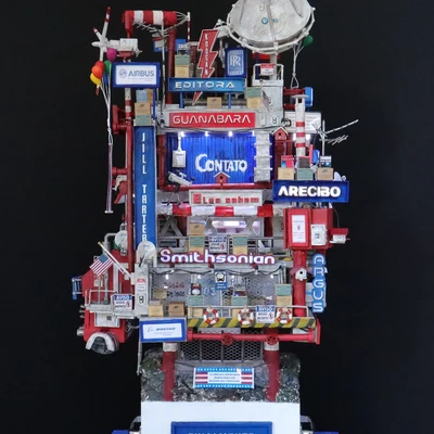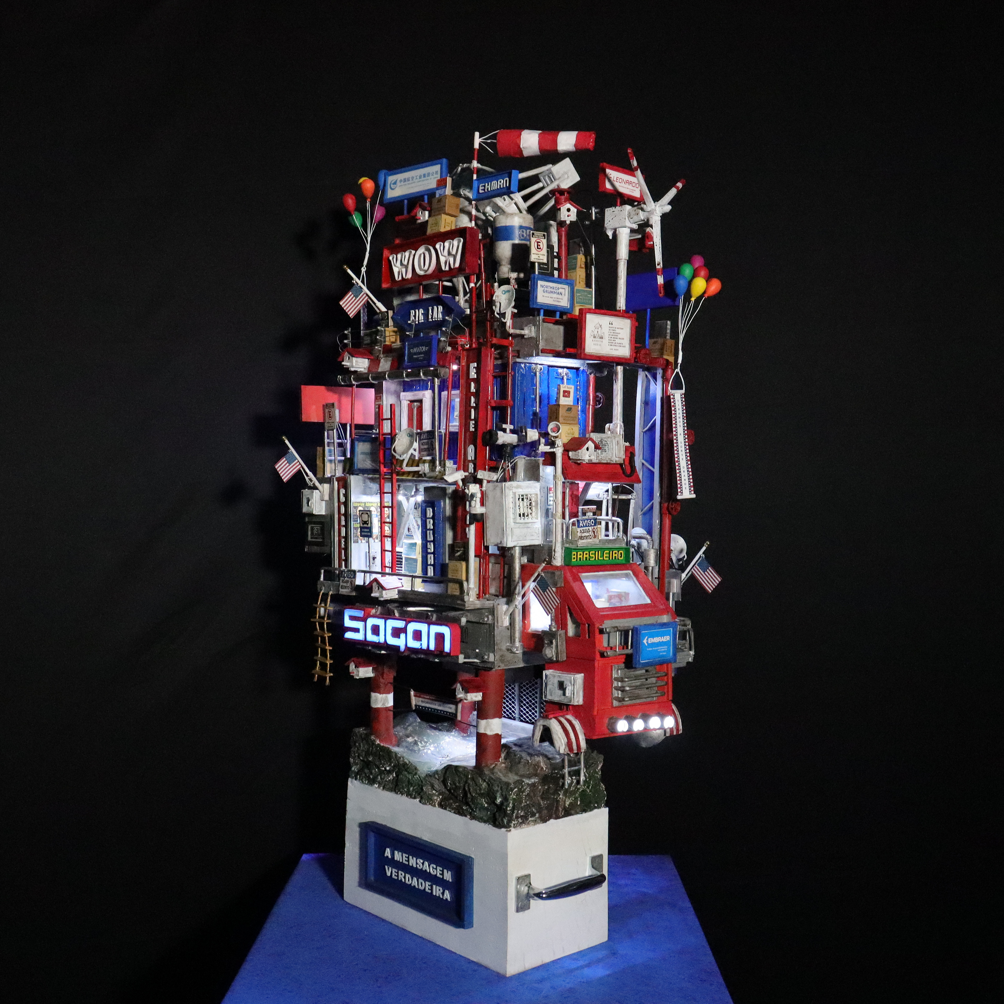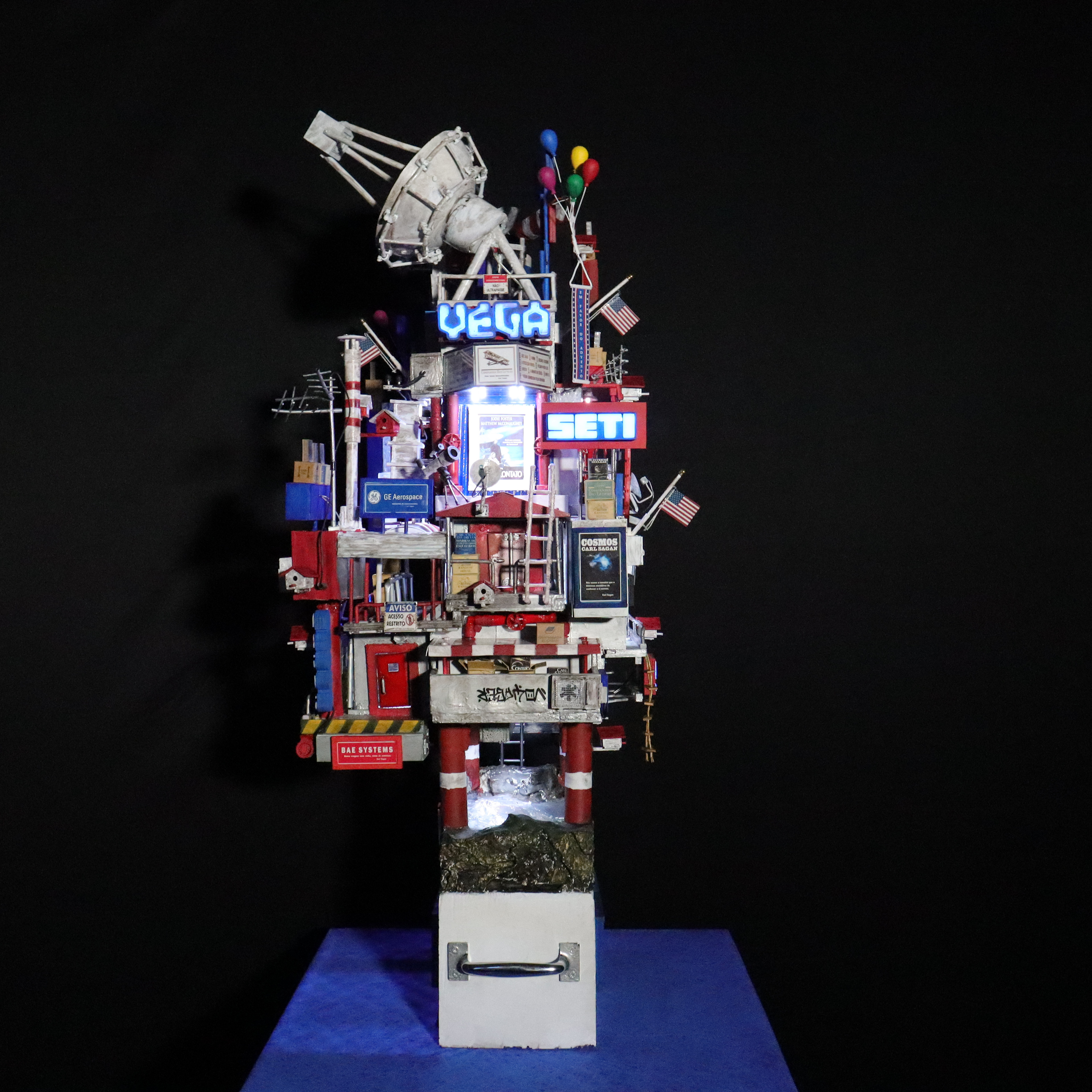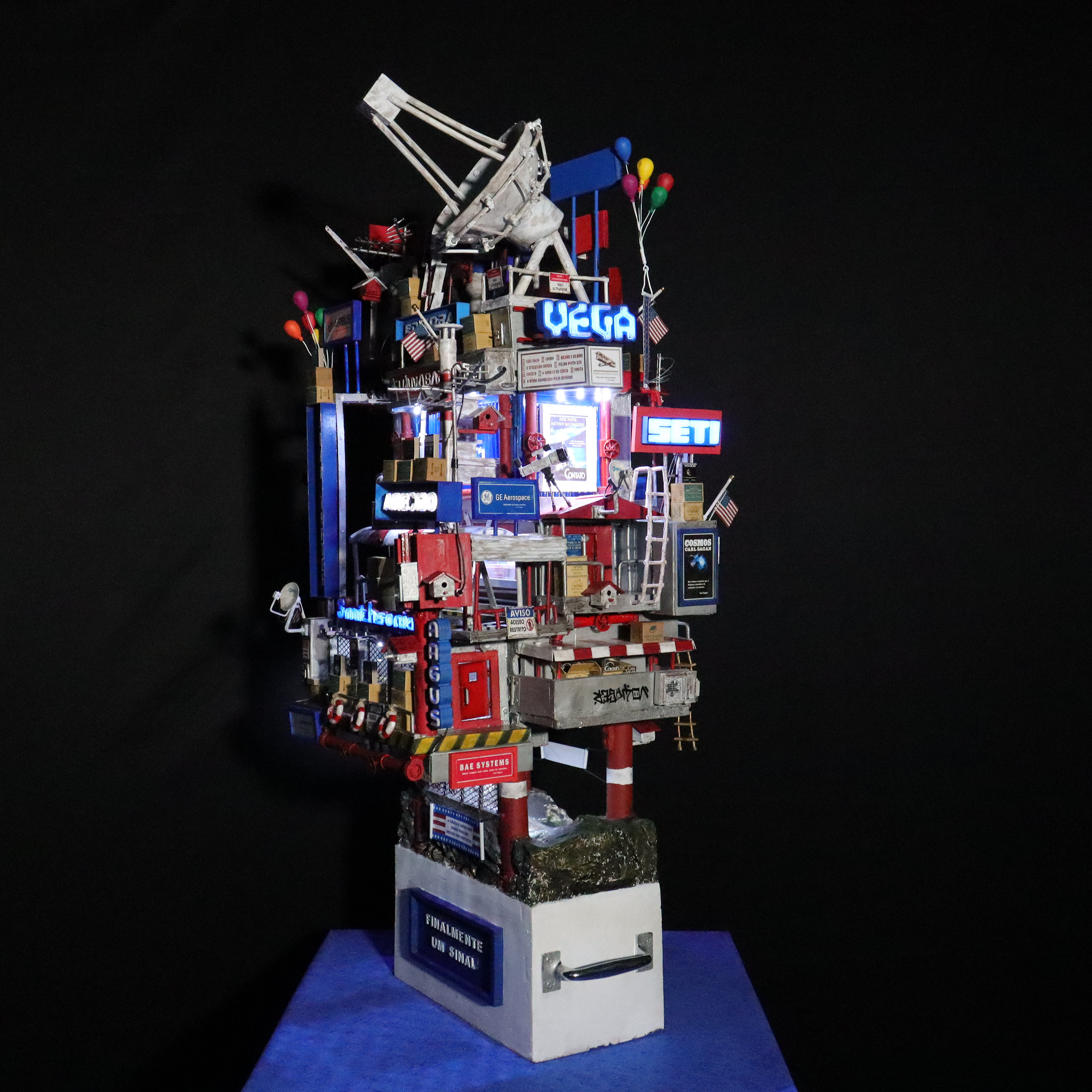 Quando a humanidade estiver pronta e for inteligente o suficiente para entender aquilo que captou como último contato, finalmente um sinal acontecerá e a mensagem verdadeira lembrará ao mundo sobre Carl Sagan e um artista brasileiro que o homenageou em sua época com sua obra de arte a respeito de um tempo futuro muito próximo, e então esta mesma peça que hoje ocupa o ArtStation de maneira desconhecida, quase invisível, será vista e apreciada pelo público em geral como uma maquete artística autoral que em seu momento de origem já pressagiava o impossível de ocorrer na mente de uma civilização que custava a perder sua ignorância terrestre, não apenas em termos de aceitar que seres inteligentes de outros planetas realmente existem, em algum lugar menos ou mais distante, do mesmo modo como uma obra de arte também pode estabelecer uma comunicação extraordinária através de sua expressão visual inédita, pois de todos os tipos de arte existentes em nosso pálido ponto azul, a minha certamente é a única cuja forma surpreende porque o conteúdo jamais se esgota, uma vez que minha escultura em mídia mista pode ser olhada, vasculhada e pesquisada milhões e milhões de vezes, em busca de pistas como algo novo, e sua novidade nunca terminará, porque são detalhes possuidores não apenas do conhecimento extraído do livro e do autor que inspiraram a construção, mas fundamentalmente aquilo que existe de muito mais misterioso e secreto por trás de um visual cativante e produzido lentamente como o próprio Universo; afinal de contas, são histórias, palavras, frases, nomes, desígnios, propostas, propósitos e toda sorte de símbolos, simbolismos e simbologias, os quais, independentemente do observador perceber e conhecer ou não o tema a respeito, tornam minha criação verdadeiramente infinita, exatamente como sua iluminação, que através das luzes que se acendem e se apagam, transformam algo familiar de dia em algo totalmente surpreendente à noite; assim é De Volta para Carl Sagan – O Último Contato, o começo de uma comunicação astronômica e artística, uma obra que embora tenha sido captada por mim em um instante de inspiração, de maneira espontânea e numa passagem de criatividade, ainda assim seguiu sendo construída até o final, mesmo diante de tanta dificuldade, após muita leitura, estudo, pesquisa e experimentação, agora representa finalmente um sinal que nunca termina, pois a mensagem é verdadeira e permanece sendo procurada e aguardada por nós a todo momento, mesmo eu sabendo que talvez não esteja vivo para apontar a estrela de onde os tais habitantes vieram, pois Deus me fez criador e criativo para pessoas que ainda nem nasceram para apreciar aquilo que está acima da minha época e muito além do meu próprio tempo. Desta maneira, encerro este texto escrito à mão e em seguida digitalizado, da mesma forma única e exclusiva como minha arte é produzida e depois levada para o digital –, assim termino torcendo para que alguém, em algum lugar menos ou mais distante, retorne com alguma comunicação para este sinal que por enquanto, por conta do desconhecimento e da invisibilidade da peça, ainda é fraco, afinal de contas, não basta iluminar a humanidade com muito brilho e brilhantismo, é preciso ensinar às pessoas a inteligência de saber valorizar a própria luz.