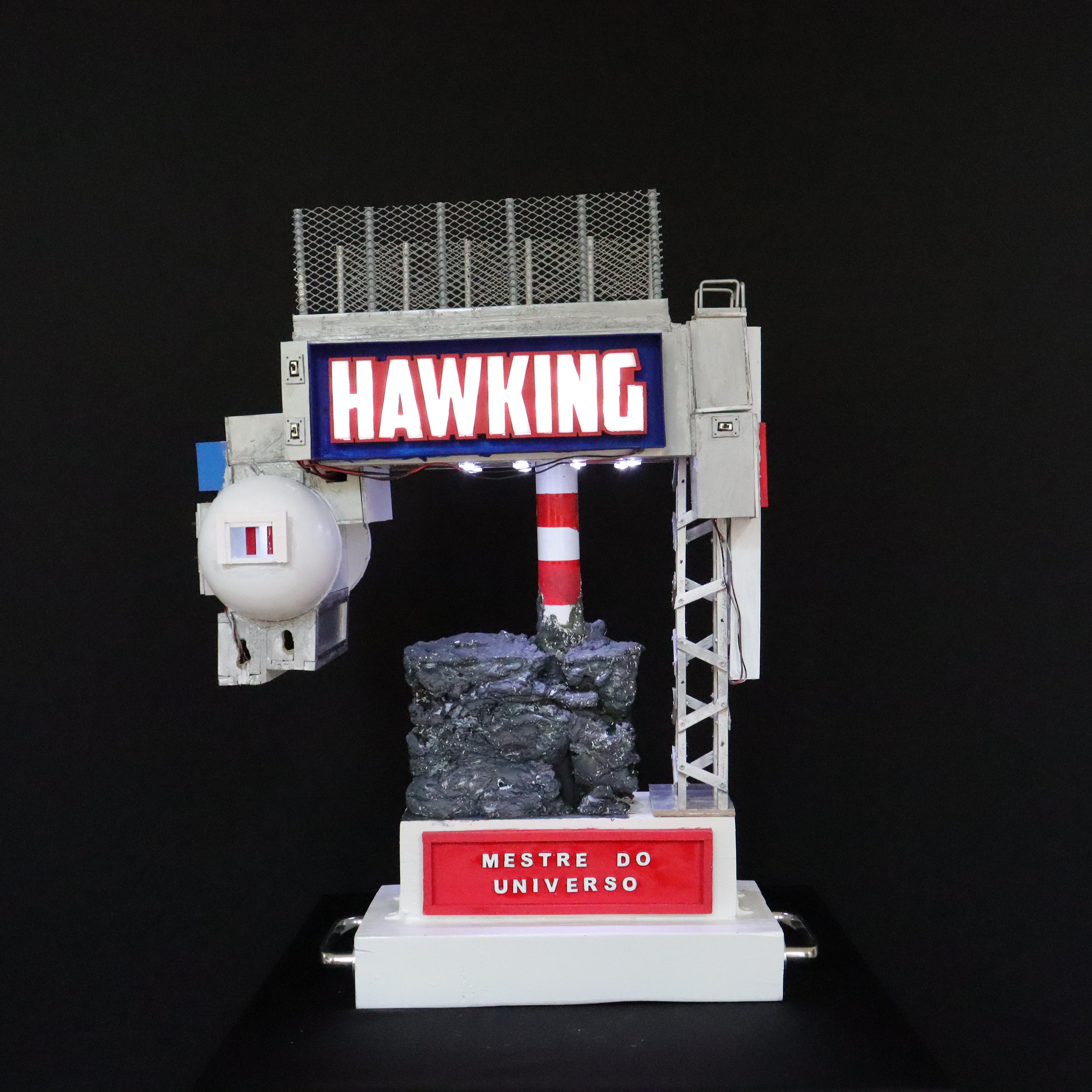 Assim como o livro O Universo Numa Casca de Noz fala sobre diversos temas ligados ao Universo e o título Uma Breve História do Tempo reúne textos sobre os mistérios da física – desde a mecânica quântica até a dinâmica das centenas de galáxias –, minha obra O Universo Numa Casa de Hawking – Uma Breve Arquiliteratura do Tempo pretende ser um resumo visual tridimensional de todas as teorias científicas apresentadas por Stephen Hawking em suas publicações, com minha construção arquiliterária servindo de base para representar as pessoas, instituições, projetos, lugares e acontecimentos que fizeram parte de sua vida, através de um cenário em formato de vilarejo ciberpunk, numa espécie de local que se desdobra em vários estilos diferentes de moradia futurista, onde cada uma corresponderia a alguém muito importante registrado em sua biografia Stephen Hawking – Uma Vida para a Ciência, de Michael White e John Gribbin, da qual minha obra é inspirada, com palavras e frases que marcaram sua jornada como pesquisador e divulgador científico sendo extraídas do livro e colocadas na escultura como um monumento memorial, desde o título do documentário televisivo Mestre do Universo, que o lançou mundialmente para o grande público, até a Universidade de Cambridge, que o acolheu e o consagrou como um dos maiores cientistas de todos os tempos, dando ao design que criei o mesmo sentido e conceito da sua famosa teoria de tudo. Muito mais do que fazer uma associação brilhante entre os livros O Universo Numa Casca de Noz e Uma Breve História do Tempo com o título que escolhi O Universo Numa Casa de Hawking – Uma Breve Arquiliteratura do Tempo, que esta obra possa ser um marco histórico em minha carreira como minha melhor homenagem criada até agora.