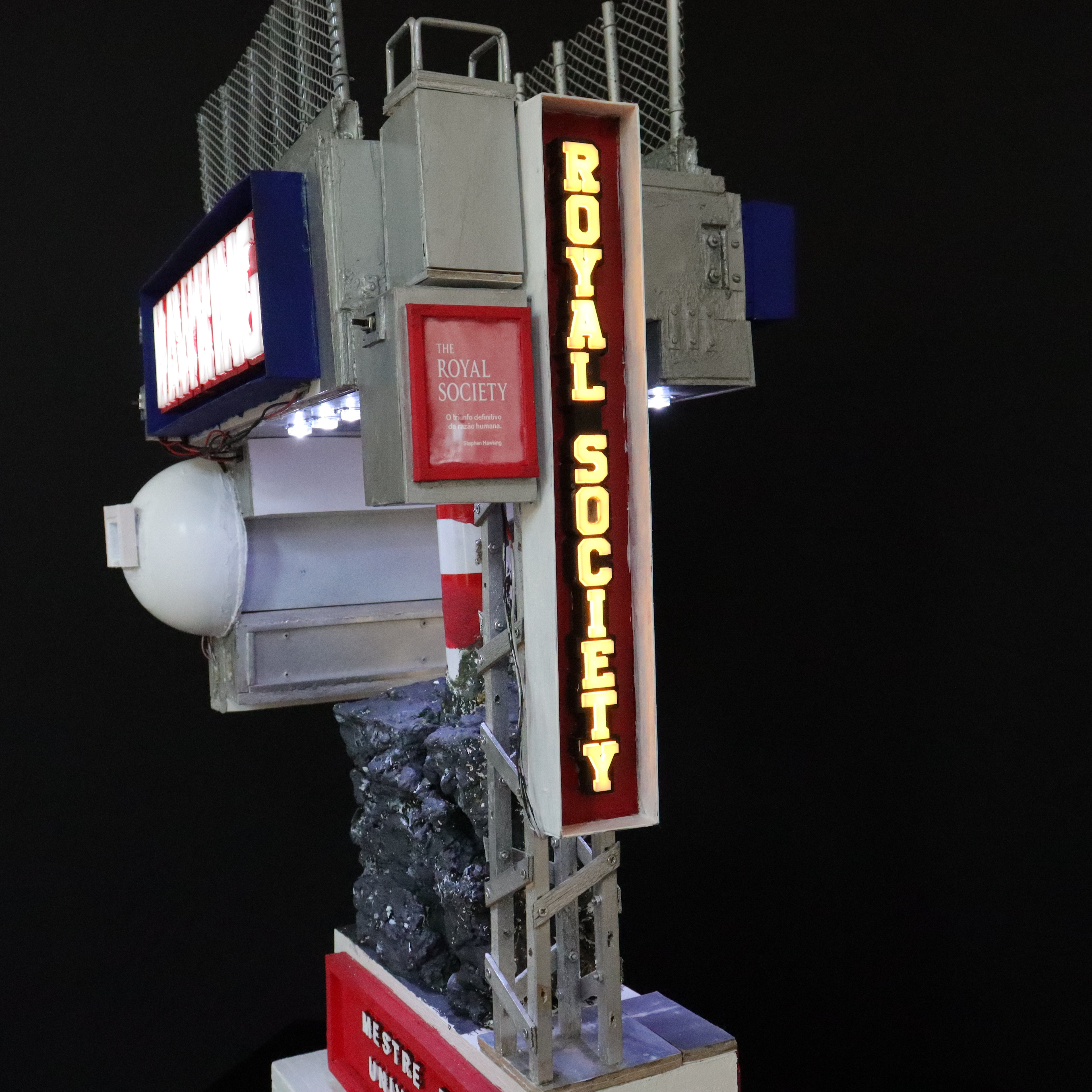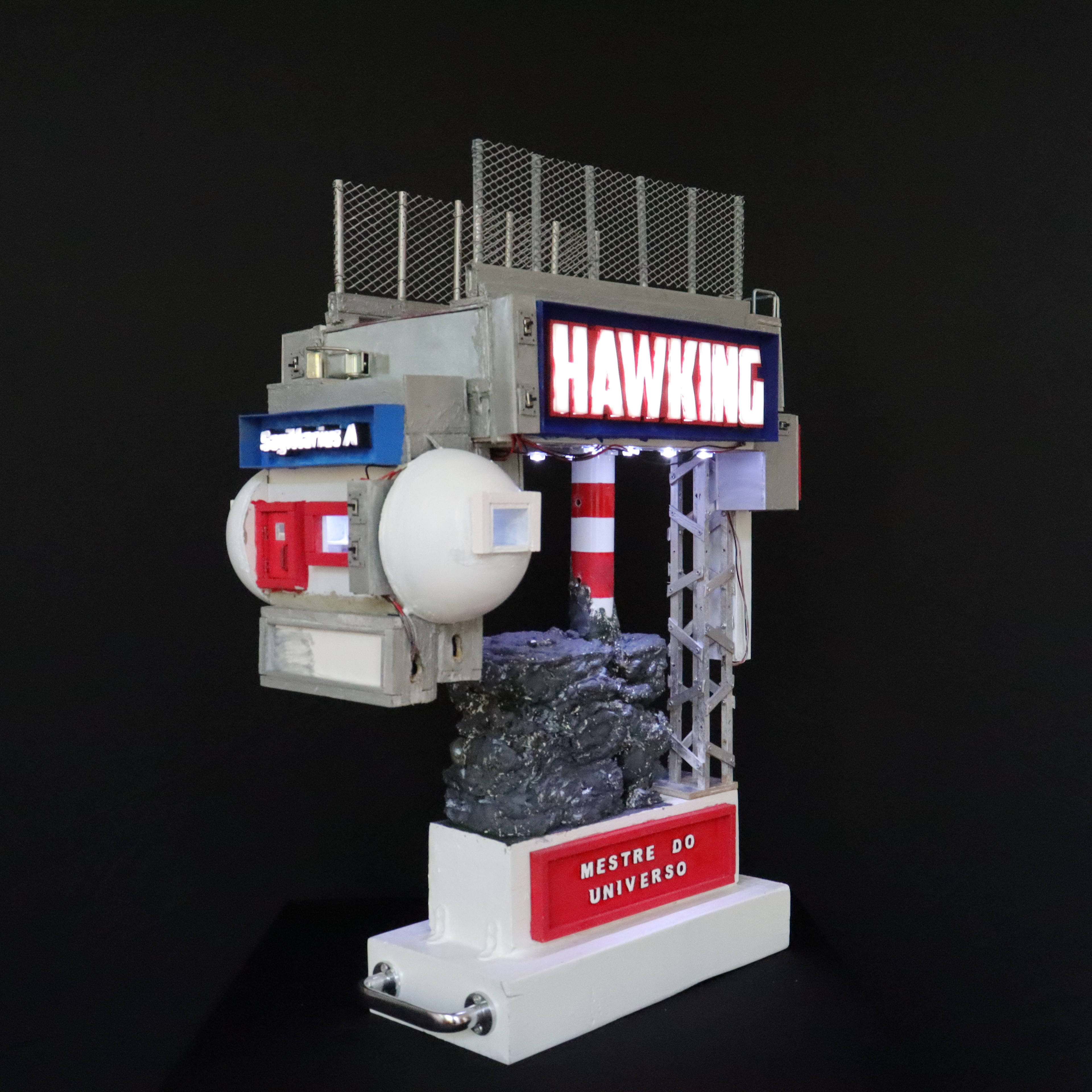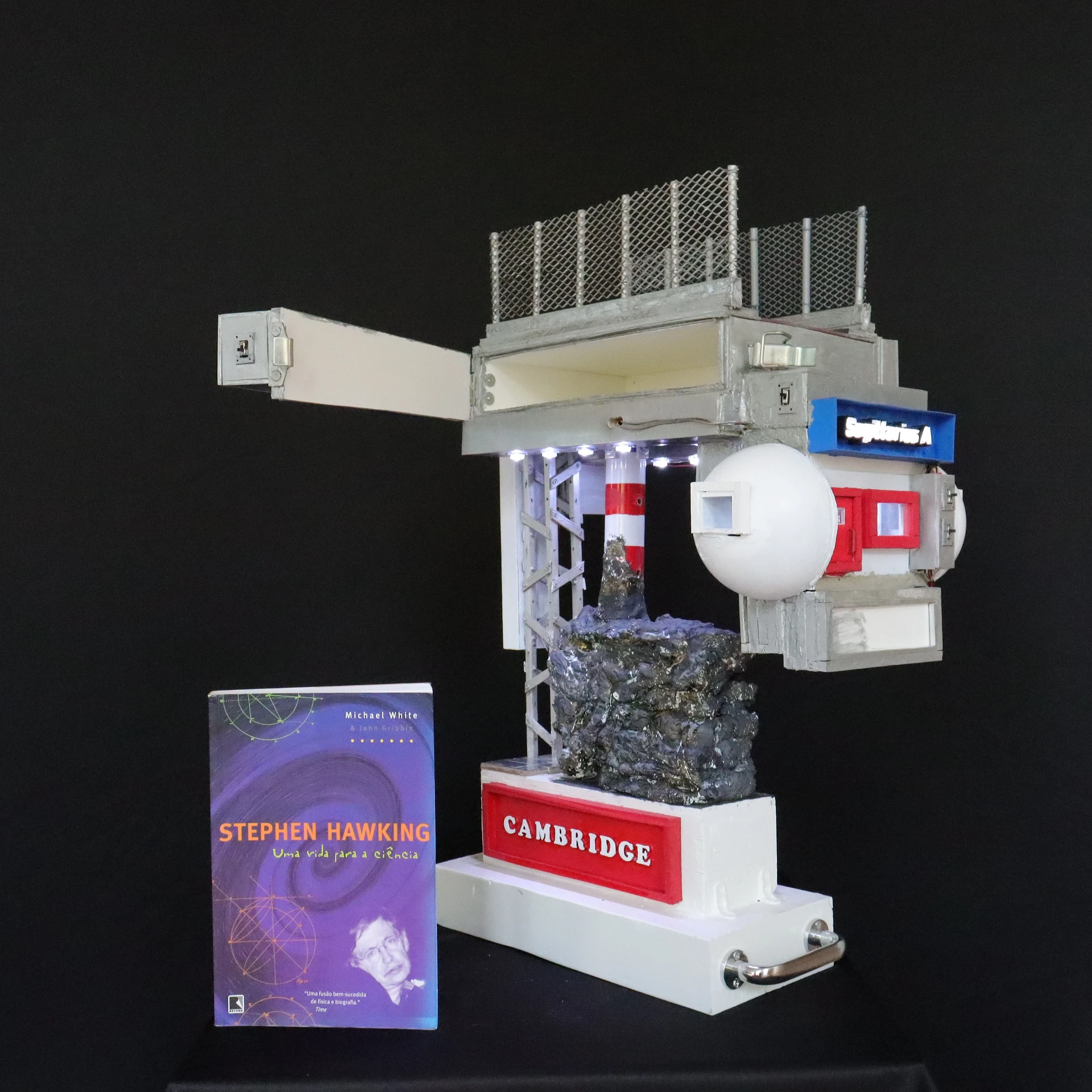 Construção Arquiliterária em andamento | Título: O Universo Numa Casa de Hawking – Uma Breve Arquiliteratura do Tempo | Obra da Série: Arquiliteratura Científica | Mais uma Peça da Coleção: Troféus | Dimensões: 72x43x33cm | Técnica: Assemblage | Tipo: Escultura em Mídia Mista | Ano: 2026